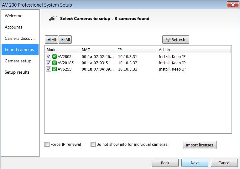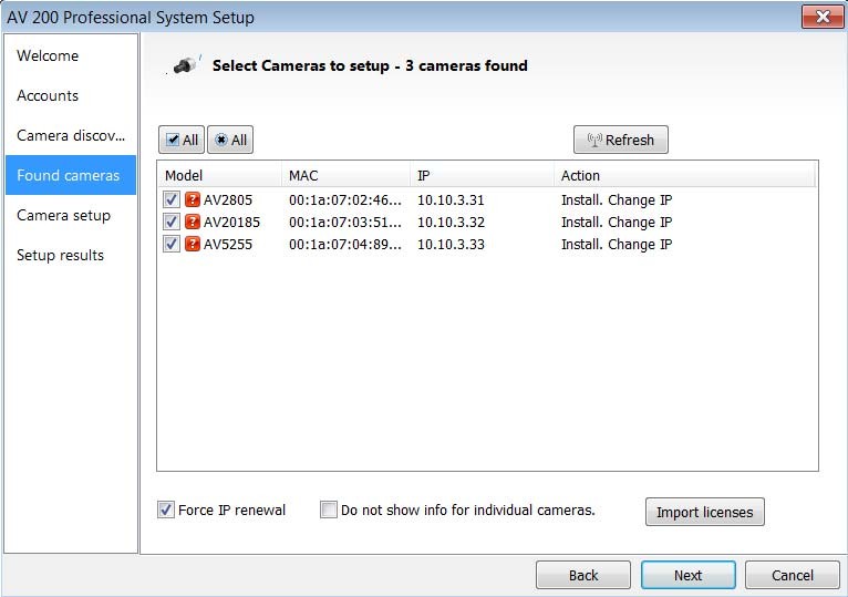 The Refresh button provides an option to make sure all cameras are found or to rediscover cameras that were connected after wizard started.