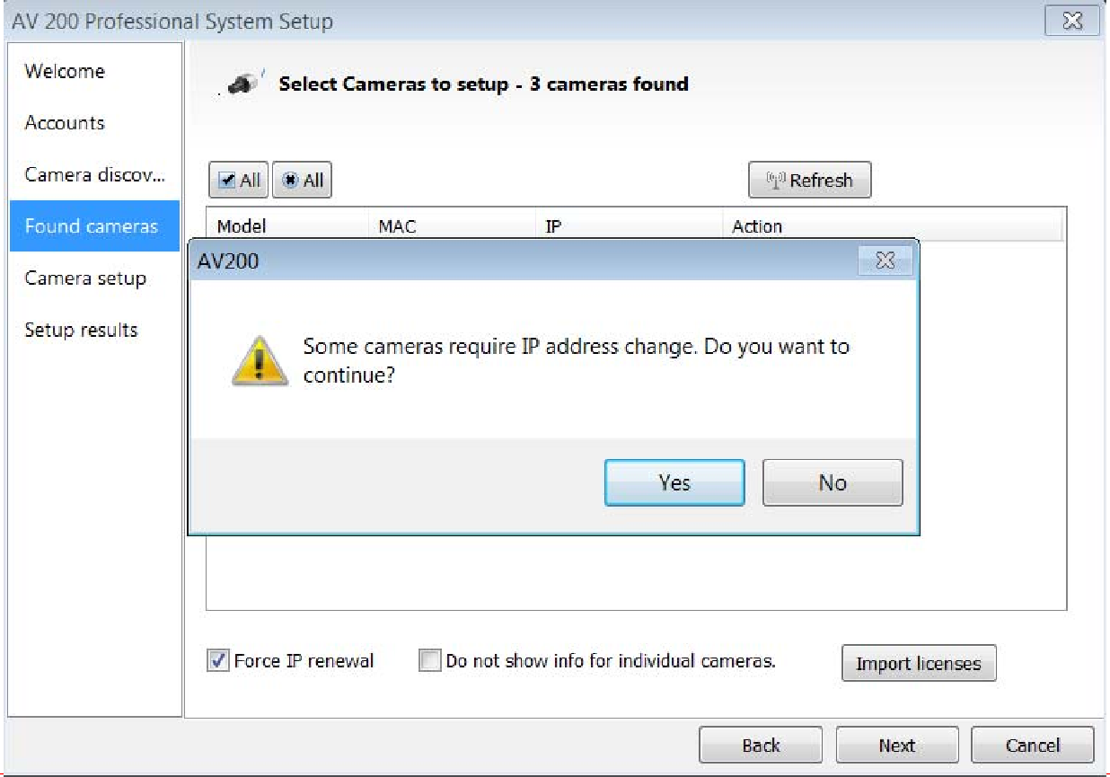 Individual confirmation screens for each camera can be skipped, but the software will change the IP addresses of each camera found without confirmation.