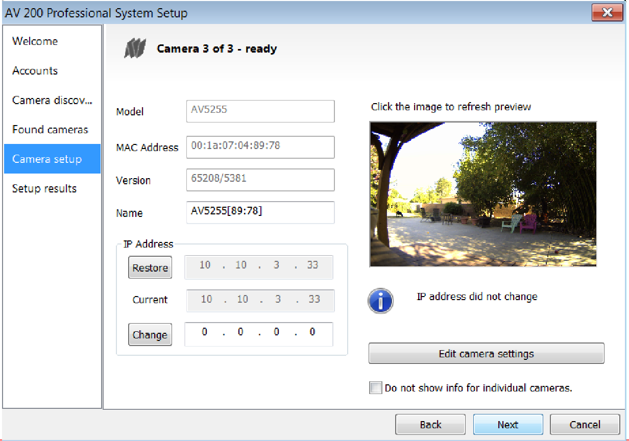 To change all the addresses and skip to the end of the set up process, check the radio button called do not show info for individual cameras.