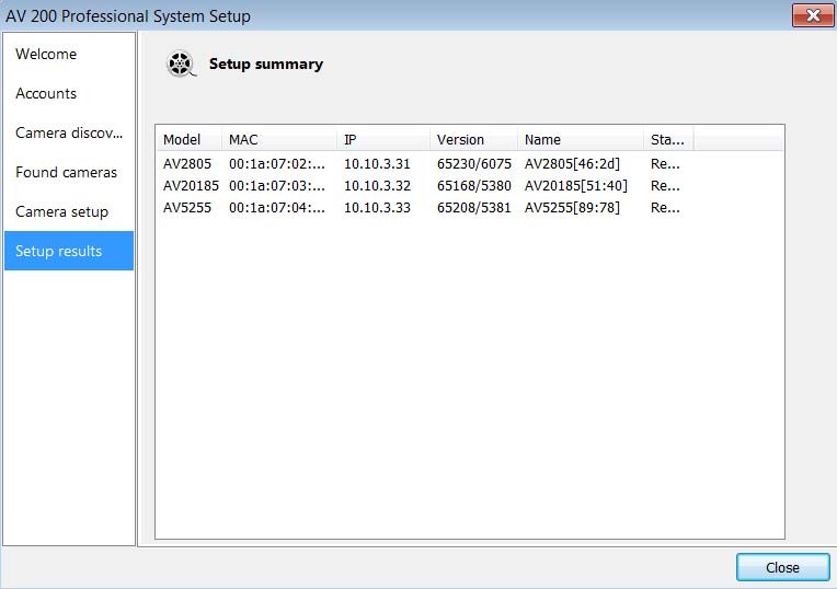 Following the camera discovery process a summary of all cameras set up in the system will be displayed.