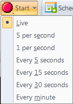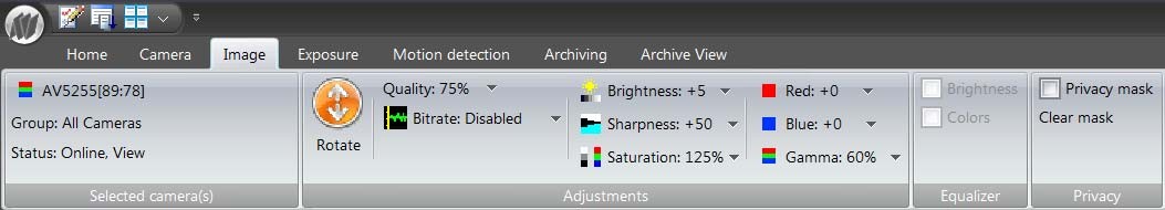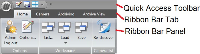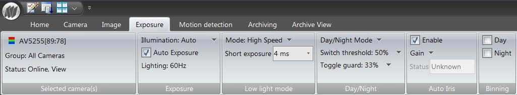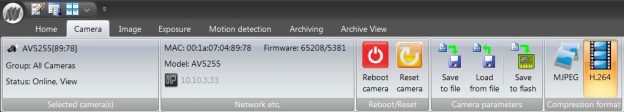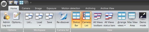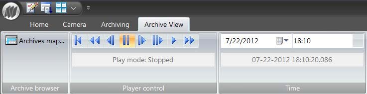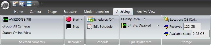 When the Start tool is selected, the ribbon bar displayed will change to the Archiving tab allowing change of the live camera recording functions.