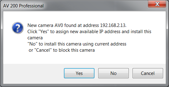 The function When New Uninstalled Camera Found determines the software behavior in this instance. If the Prompt for Installation is set (default setting), the software will prompt to add the camera and automatically assign an IP address to the camera. If the Notify and Set as Blocked option is set a prompt will notify the user the camera was found and it will be added to the camera list as blocked until Re‐discover function is run again.