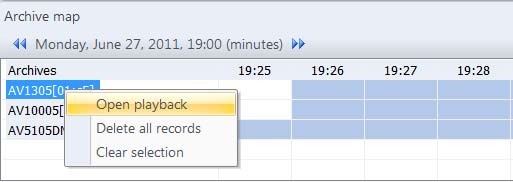 When Archive Map is displayed, a camera can be selected for playback by left double clicking on the camera title of the camera to be played back. Options include Open Playback (opens a camera playback window for a selected camera and Clear Selection (clears the currently selected time frame on the map for the camera selected).