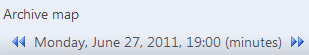 The time frame displays the currently selected active time for playback, and the selected increment of time displayed on the Archive Map. The active time line displayed in the map can be scrolled forward or backwards using the double arrow icons on either side of the displayed playback time.