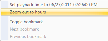 Playback time for the selected window can be set by choosing a time increment in minutes or hours where archive is available for the camera with currently open playback window and left clicking on a time period in the Archive Map and selecting the Set Playback Time To. The play back time option displayed in the pop‐up menu will be for the day and time increment clicked on.