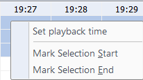 Playback start time for a camera with an open playback window can also be selected from the map by left clicking on a time increment for an available archive to the right of the camera title. Here the pop‐up menu displayed allows the option to Set Playback Time to the archive increment selected. There are also options here to Mark Selection Start and Mark Selection End. These options are used to select a start and end point for a video clip to be