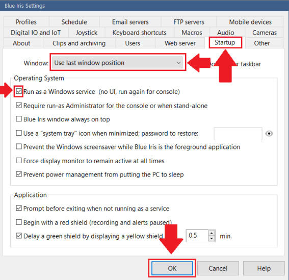 Inside the Startup tab, make sure the “Use last window position” option is selected in the Window field then click on the “Run as a Windows service (no UI, run again for console)” checkbox. This will enable your software to run as a Windows service. Click OK to continue.