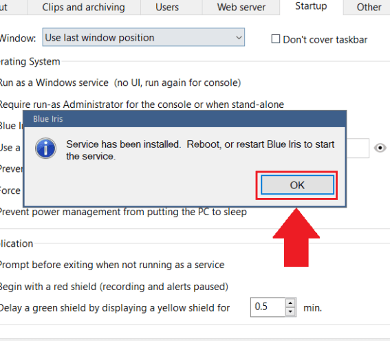 Step 3: The service will install automatically. Click OK to reboot or restart the Blue Iris software.