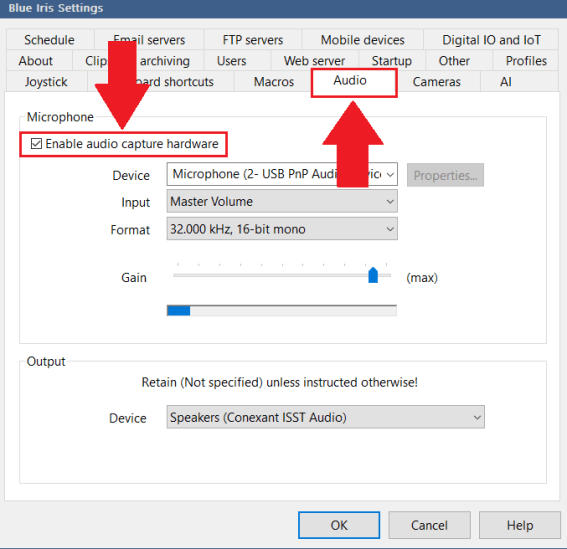If your camera supports two-way audio and you are using it in Blue Iris, two-way audio can be configured directly in the software. Please make sure a compatible microphone is set up and configured on your computer before enabling it in Blue Iris. For more information on how to enable two-way audio using Blue Iris please refer to the information provided below.