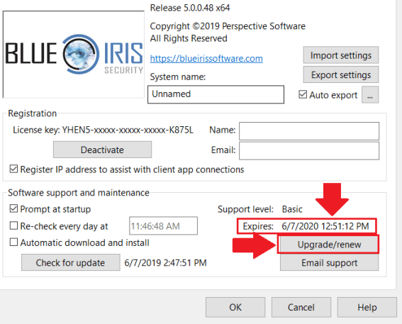 Any expired keys in the Blue Iris 5 software will cause the software not to work with any connected cameras and may cause them to be inaccessible. Keys in the Blue Iris software provide up to one year of service from the initial start date of your license and will need to be renewed before they expire.