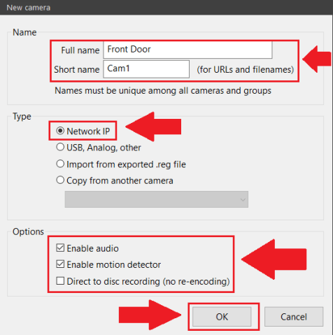In the new camera menu, give your camera a name, a short name (for URLs and filenames), choose a type, which in this case will be a Network IP, and enable any options such as, enabling audio, motion detection, etc. Click OK to continue.