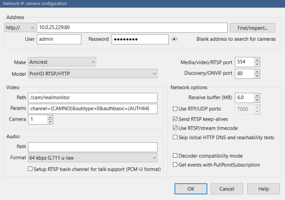 This will open two windows. The top window will be Network IP Camera Configuration. Enter the address of your camera (IP Domain or DDNS as well as RTSP address) and click on the Find/Inspect… button on the right to confirm. Enter the username and password, select the make as Amcrest, select the model of your device (ProHD and HDseries cameras as “ProHD 1080p RTSP/HTTP”), and specify the RTSP and ONVIF ports.