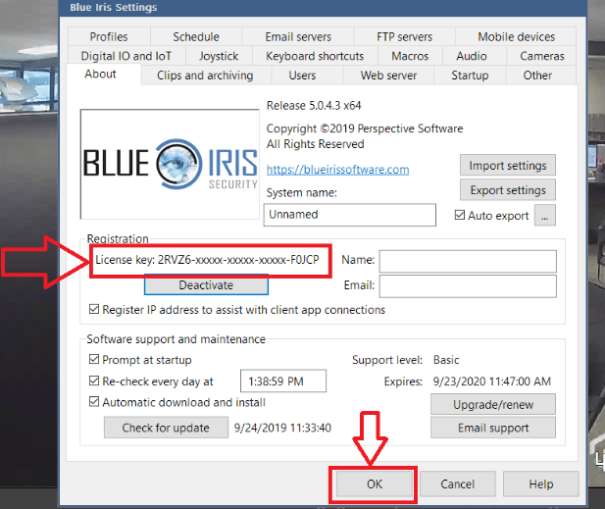 Step 5: The new license key has now been applied to your Blue Iris software. The information can be viewed in the License Key section of the menu. Click OK to continue.