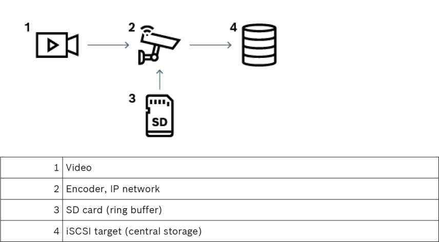 Changes an analog stream to a digital stream, e.g., to integrate analog cameras in a digital system like Bosch Video Management System. Some encoders can have a local storage like a flash card, a USB hard disk, or they can store their video data on iSCSI devices. IP cameras have an encoder built in.