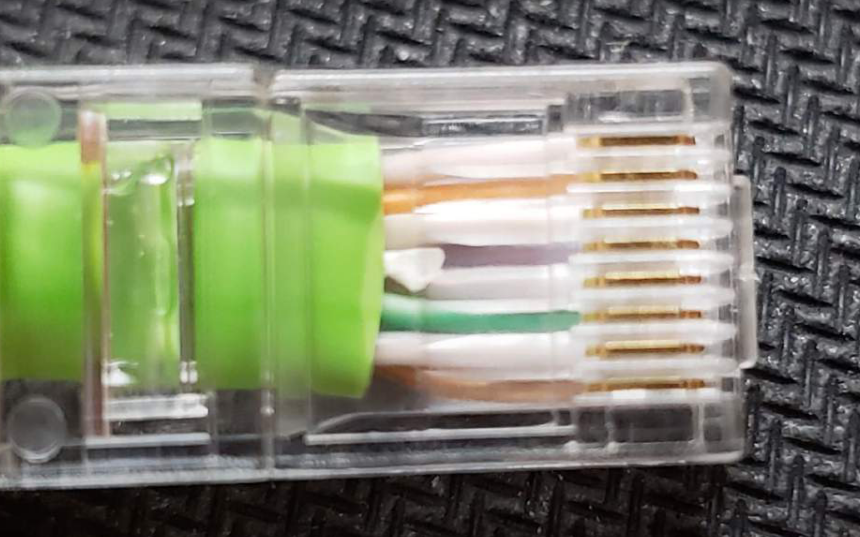 Check the wire order once more, then with clip side down, push the wires into the RJ45