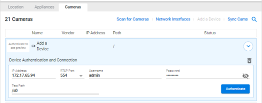 Step 5: Once you have entered the information. Please click Authenticate. If all inputs were valid, you will see a still image populate from the cameras with a few streaming options.