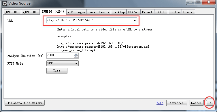 Find “FFMPEG (H264)” this column, fill in information of RTSP in the URL.After adding can test is successful