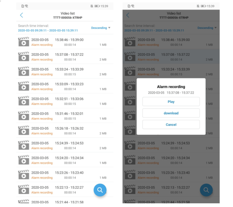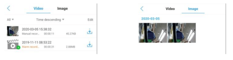 Find the camera to be viewed in the camera list interface, click the iconhttps://i0.wp.com/camhi.pro/wp-content/uploads/2021/06/Folder-Icons.png?resize=58%2C43&ssl=1, select the recording page, the recording file will be displayed, you can sort according to the size and length of the video file, click the buttonhttps://i0.wp.com/camhi.pro/wp-content/uploads/2021/06/Download-Icons.png?resize=51%2C45&ssl=1, you can save the video file to the mobile phone album. Click the edit button, it can delete the selected video file.