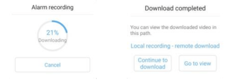 Click on the video file in the recording list interface, and then click Download, the video file will be downloaded automatically. The downloaded video file will be saved in the local recording interface. After the video download is completed, you can click to continue downloading, continue to download other video files, or click view, will jump to the local recording interface automatically.