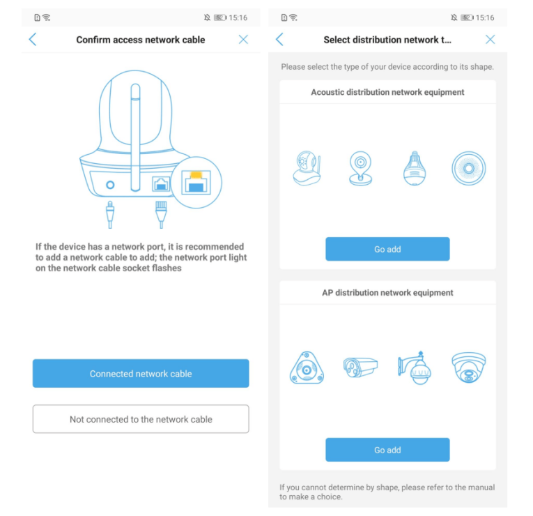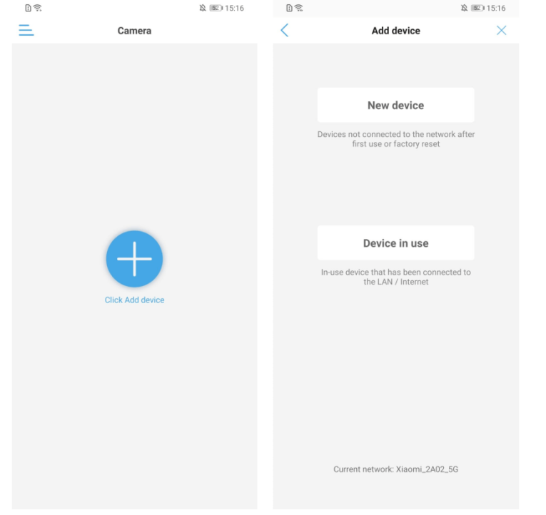 Install the APP, connect the mobile phone to the WIFI network, enter the APP and click the Add Device button to enter the Add Device interface. If it is the first time to use or restore the factory settings: the camera is not connected to the network, clicking the new device; the camera that has connected to the network, clicking on the device in use