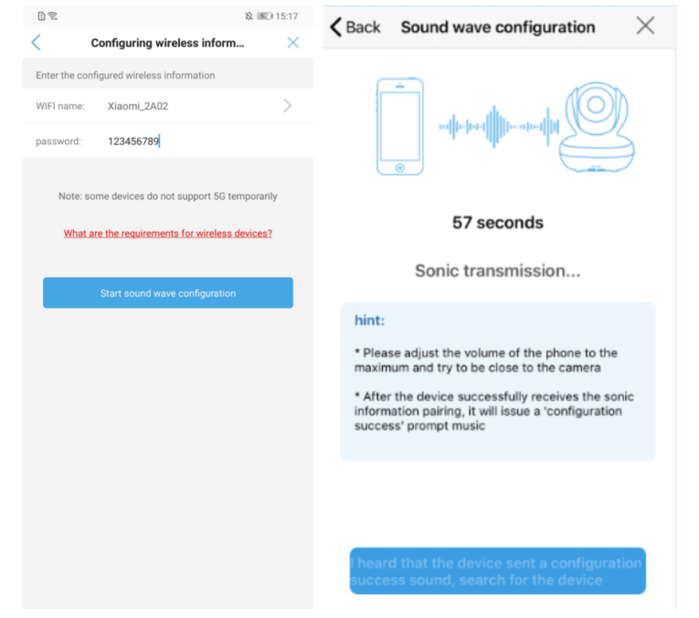 When the power is turned on, the device will enter the waiting state, and the device will send out a “beep” sound intermittently. Click Next to scan the QR code of the device UID number with the mobile phone. If there is no QR code, click Skip. Enter the password of the WIFI signal to be configured, click to start the sound wave configuration, the system will configuration WIFI automatically. After WIFI configuration successfully, there is a voice prompt