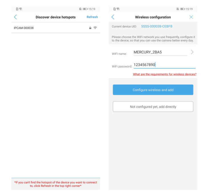 When the network cable is not connected, turn on the power, click to add, the APP will search for hotspot signals of nearby cameras automatically. The hotspot format is IPCAM-XXXXXX, the password defaults to 01234567. Selecting the hotspot of the camera to be added, clicks connect. After connecting successfully, enter the device add interface, click Add, enter the wireless configuration interface, enter the router’s WIFI password, click “Configure wifi and add”, after WIFI configuration  successfully, jump to the device list interface; if you do not want to configure WIFI, click the button ” Don’t configure, add directly”, add camera after confirmation.
