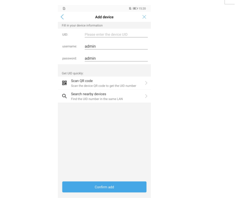 1Click the button “Search for nearby devices” to search for the ip camera in the wireless network where the phone is located, and select the corresponding UID.