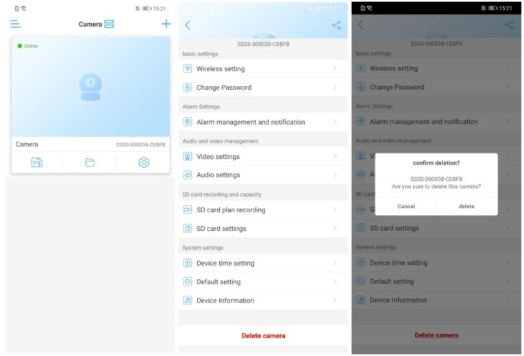 In the device list interface, long press the camera to be deleted or click the button “setting” to enter the camera setting interface, click the button “delete device” to delete the added camera.