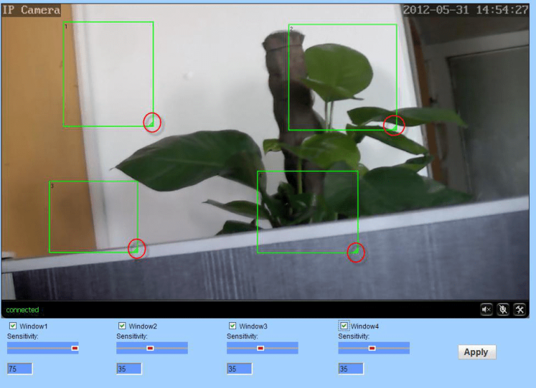 The equipment can support 4 zones setting, you can enable it through tick the option box at the bottom of page. When enable a zone, the zone box will display on the screen, and list zone number, moving mouse to this zone box, you can drag the box to any position; also can move mouse to red box at the bottom right corner, drag it to change the size. After setting, click apply, motion detection will take effect.