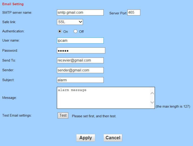 Sender address: sender email address, here is the QQ mailbox as an example, you need to fill in the QQ email address (consistent with the user name). Subjects and content can be filled in casually. After filling out, click the Apply button, then click the Test button to check if you can send an alarm email.