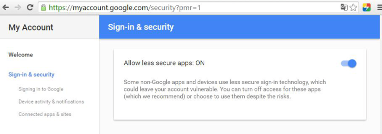 3.Some mailboxes require additional security settings, such as Gmail messages, you need to log in to your google account, open to allow less secure apps in “Sign-in & security” page.