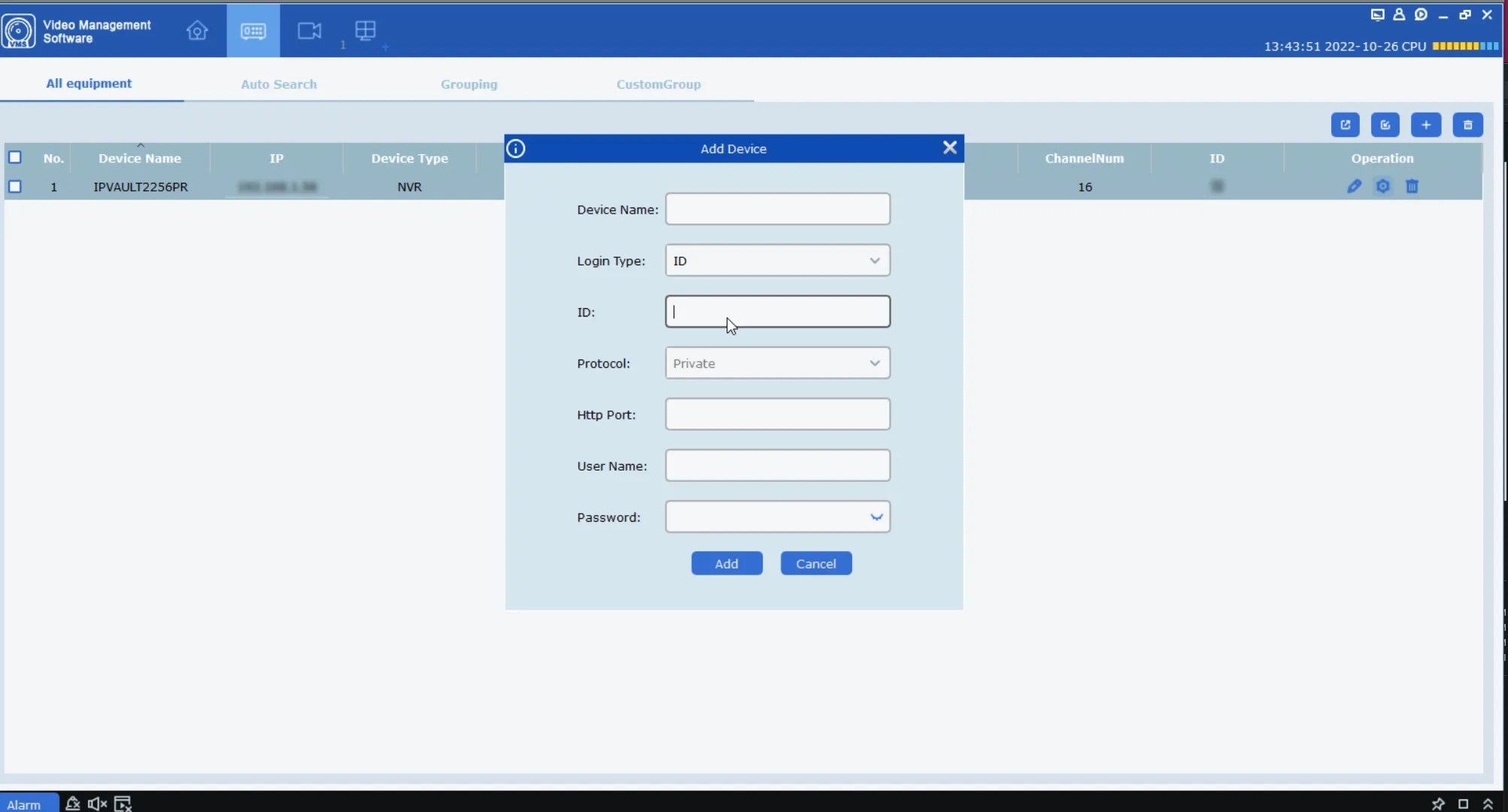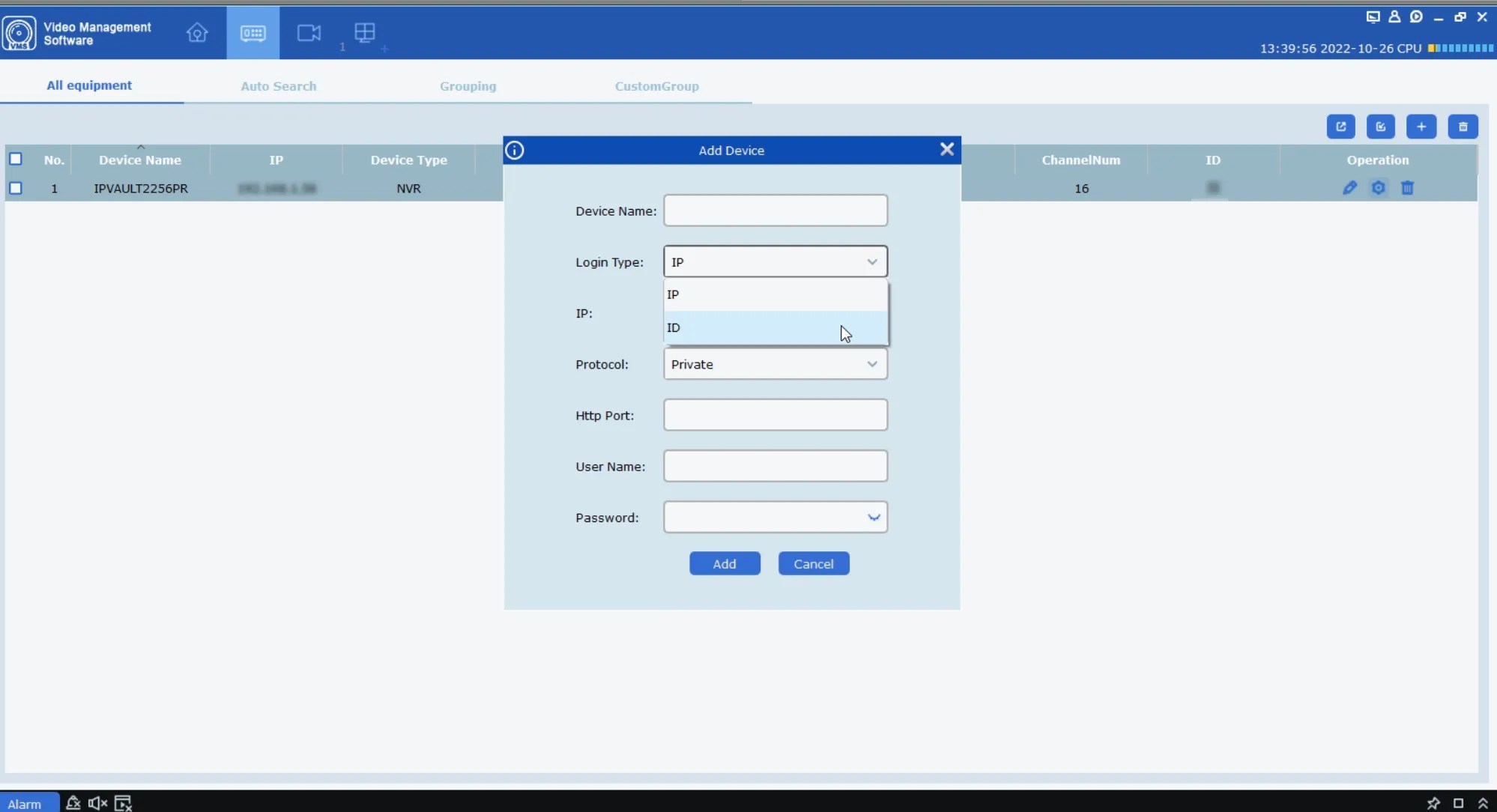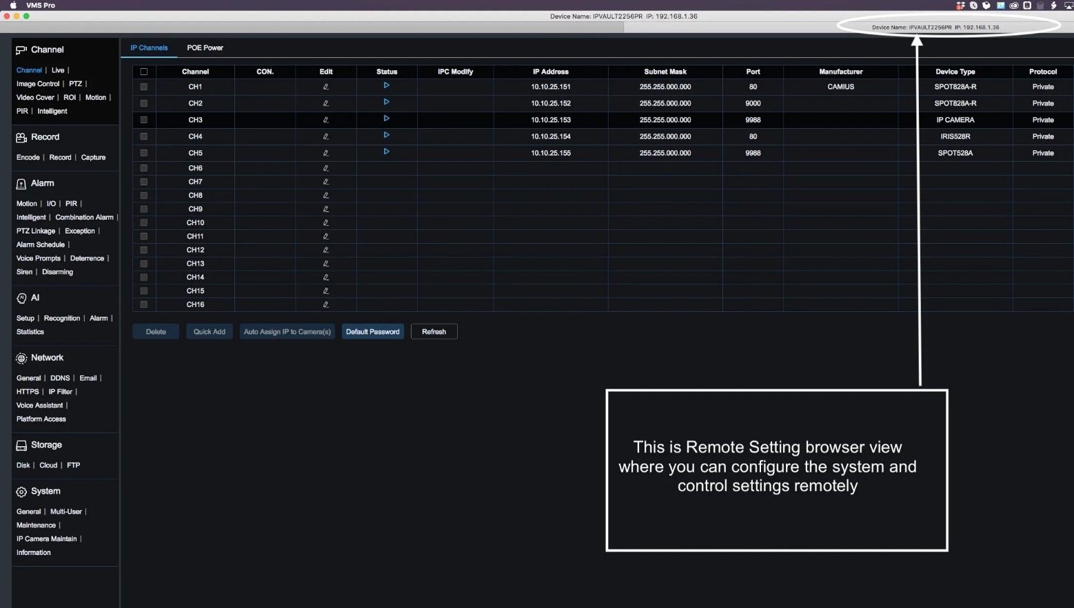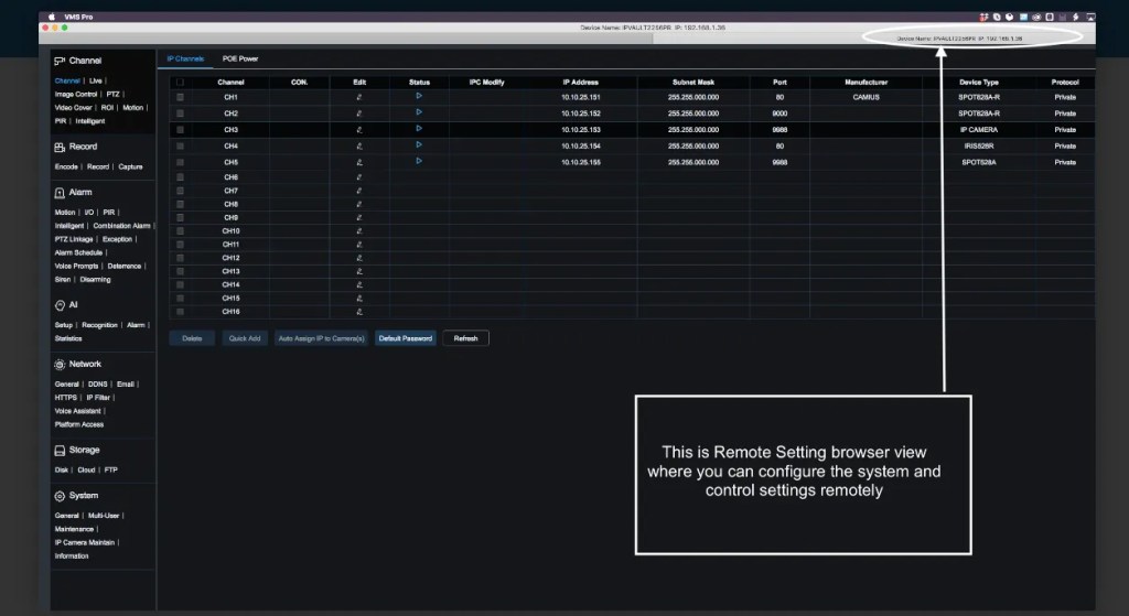 Once you have added the NVR to the VMS pro software, you can access it remotely from anywhere. Just make sure to add it using the P2P ID and not the local IP address, as shown in the following screenshots. Basically, you are accessing the NVR’s remote settings from the VMS software without a browser.