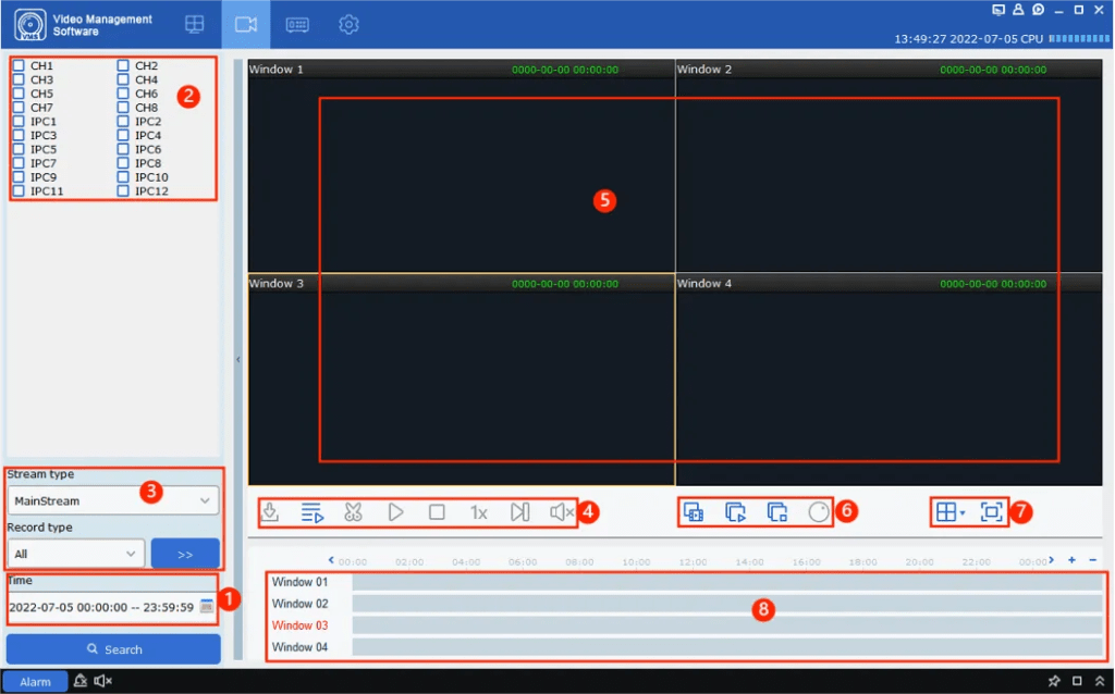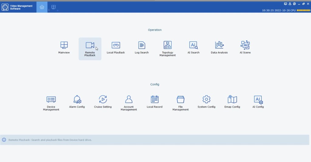 To play your DVR or NVR footage remotely on the VMS software, navigate to the Home tab >> Remote Playback (Picture 1).
