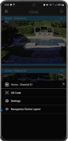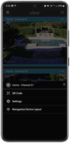 Tap the ••• icon to expand the Device Menu. Here you can view the device UUID QR code, or reorganize the the order of displayed cameras.