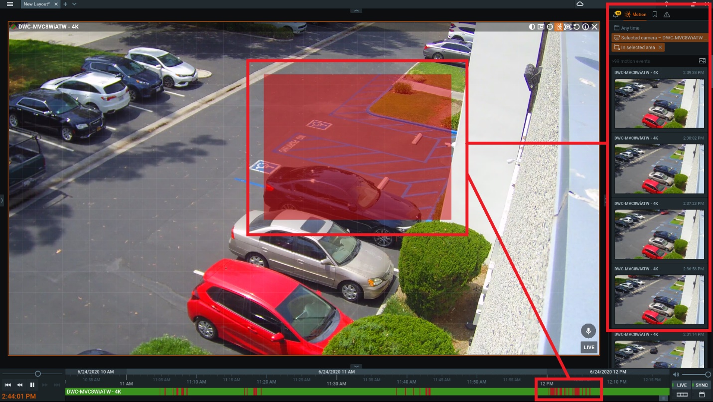 DW Spectrum’s Motion Smart Search feature is a useful tool that allows users to rapidly search video archives to discover segments of saved footage. Rather than having to review long lengths of archived footage to find a specific moment, Motion Smart Search narrows down the saved video to a specified area in the camera’s field of vision and highlights the discovered segments in the Timeline during playback.