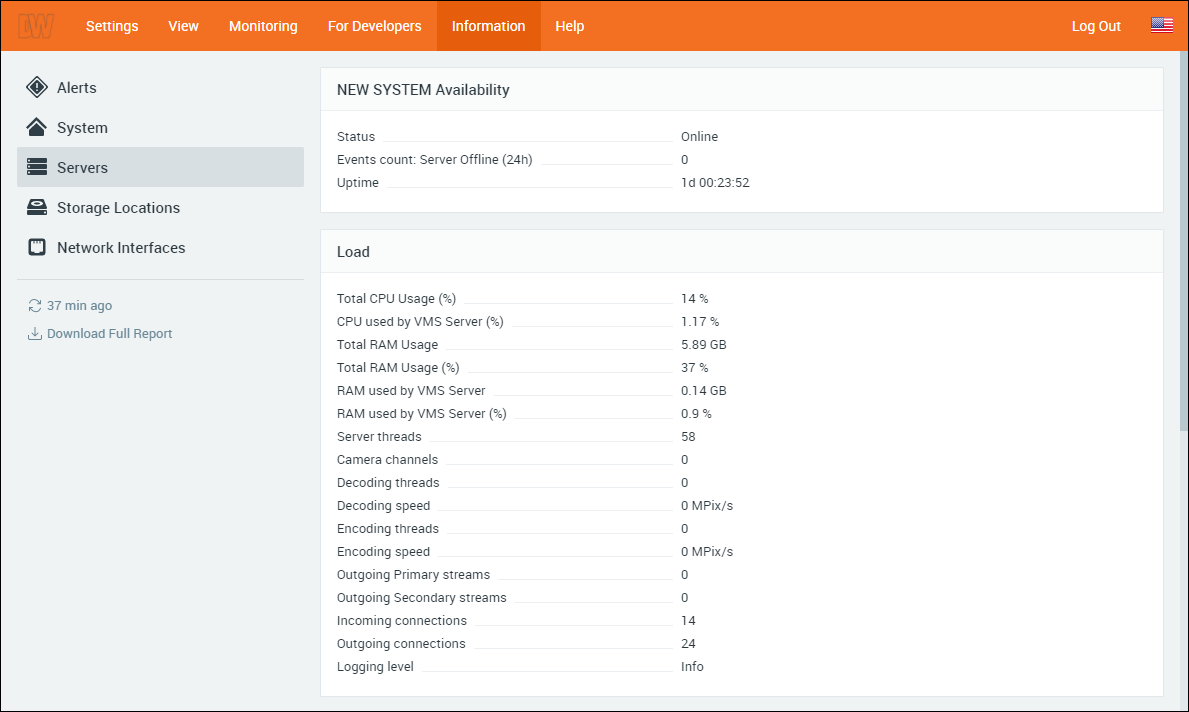 - System – displays system information including the number of currently merged servers, number of connected devices, number of storage locations, number of users, and the current software version of DW Spectrum® IPVMS in use by the system.