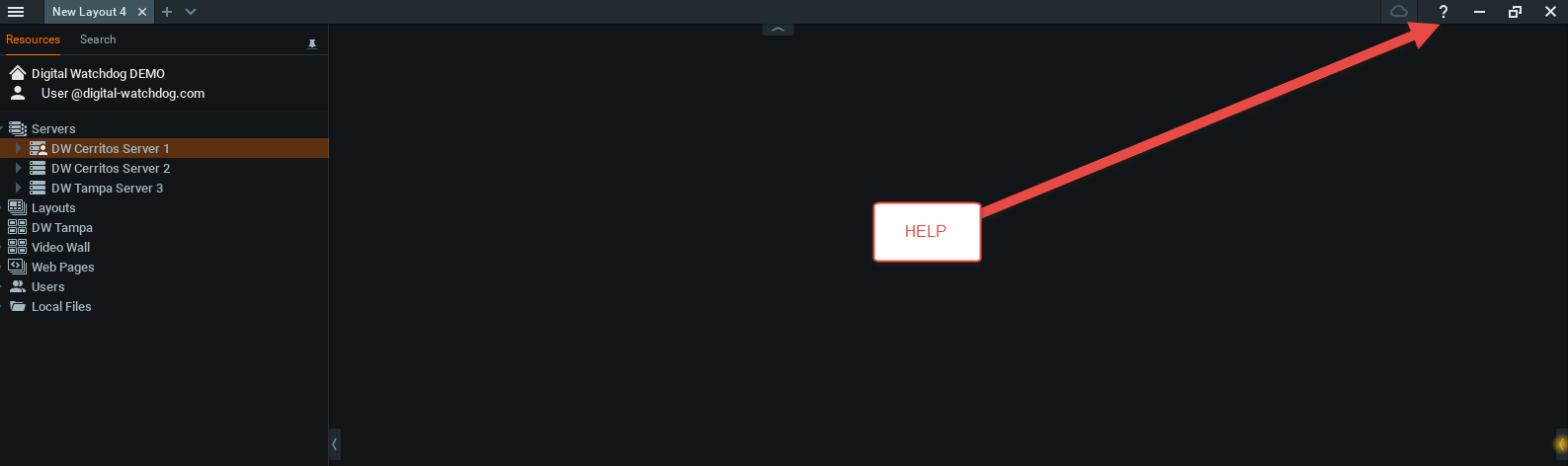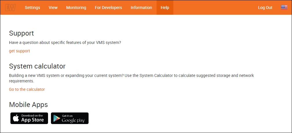 The help tab contains hyperlinks that will route you to the DW Technical Support request portal, DW Tools and Calculators page, and the mobile application page for DW Spectrum® IPVMS Mobile in the App Store or Google Play.