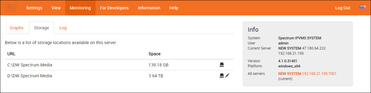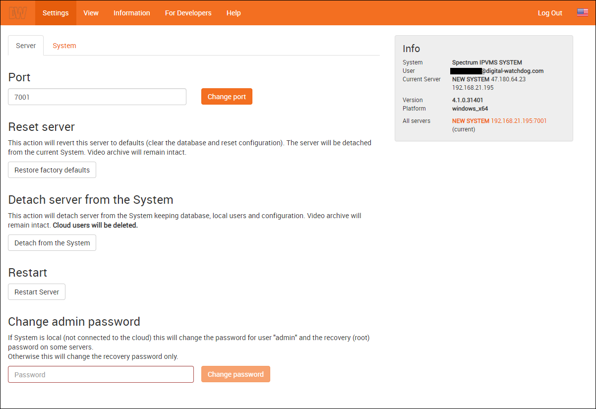 - Port – current access port used by the DW Spectrum® server for communication across network connections.