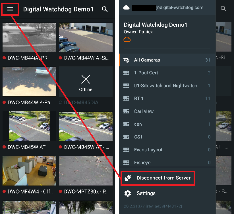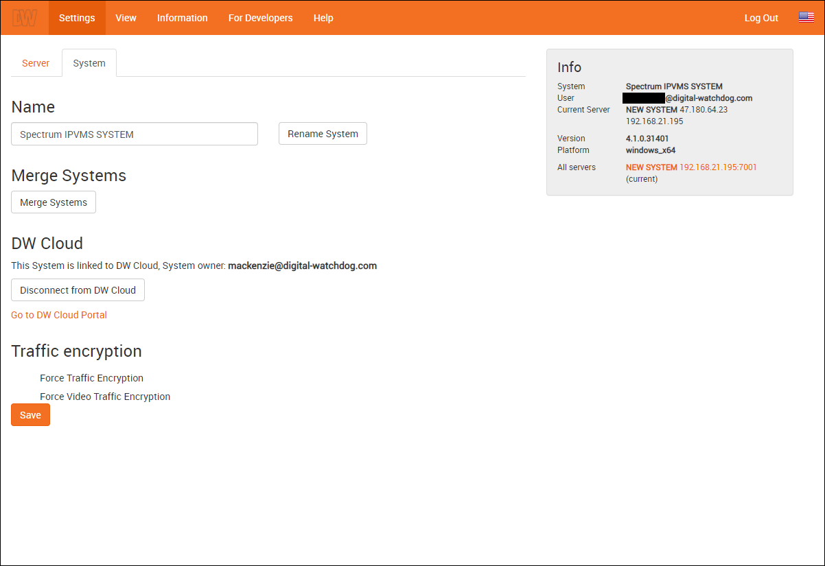 - Info – displays the system associated with the server, your current user profile, the current server and IP address, current version of DW Spectrum® IPVMS, server platform, and other associated (merged) servers of the system.