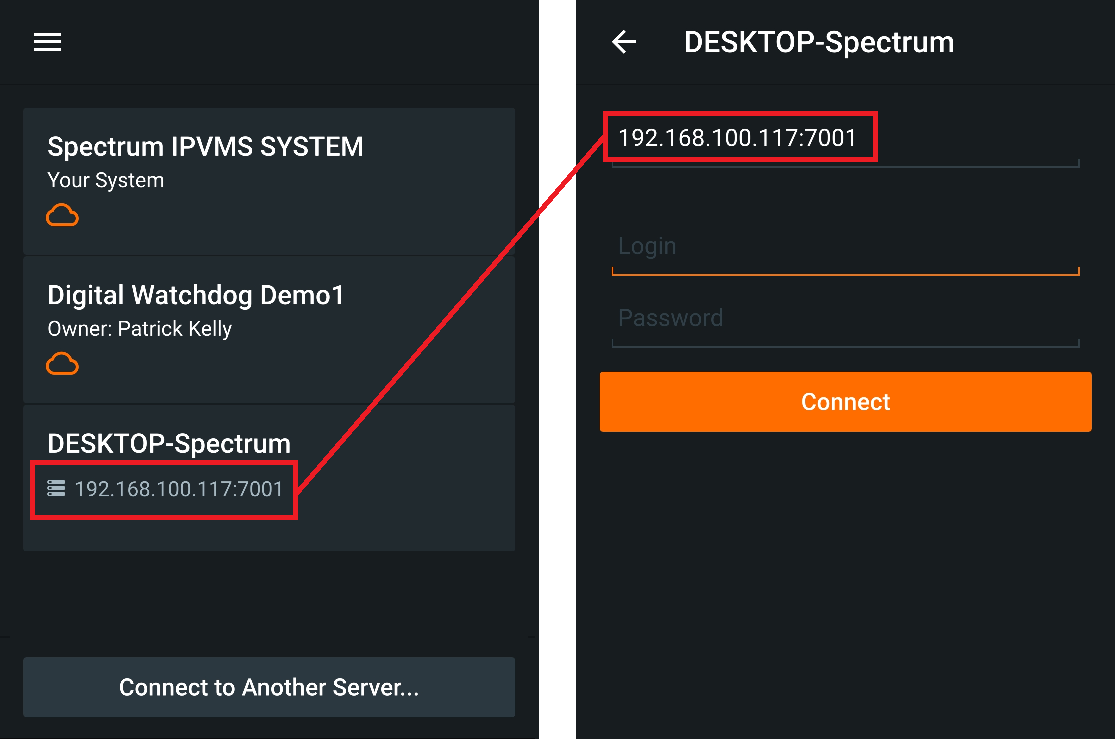 - Enter the Login and Password that you use when utilizing the DW Spectrum® desktop client