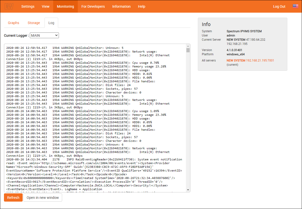 - Log – displays the system logs of your DW Spectrum® system. This information might be requested by a Digital Watchdog support member for specific troubleshooting scenarios.