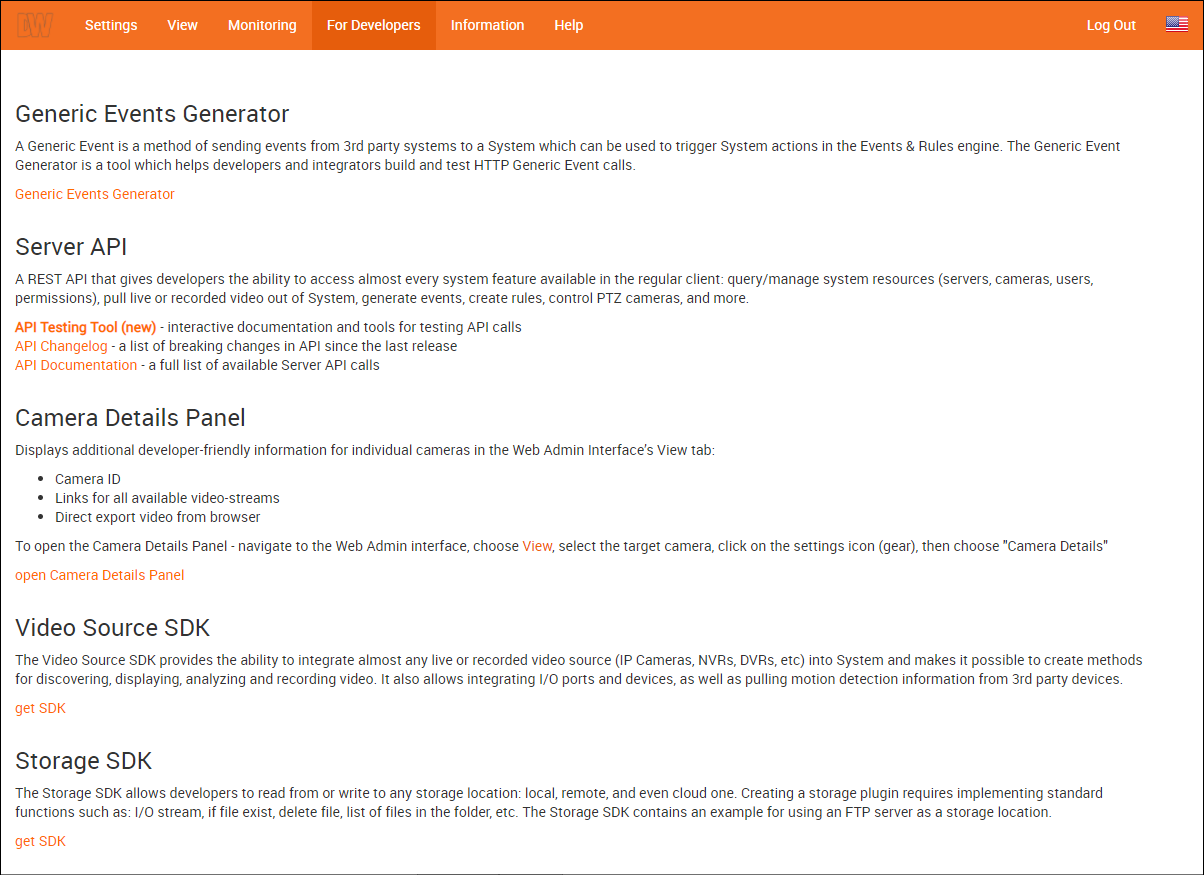 - Server API – provides developers with the ability to access almost every system feature within the regular DW Spectrum® desktop client. Includes an API Testing Tool, API Changelog, and an API Documentation list.