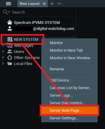 To open the web client using the DW Spectrum® IPVMS desktop client, right-click on the target server, then select Server Web Page.
