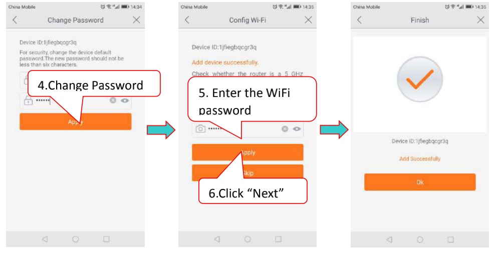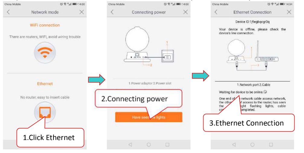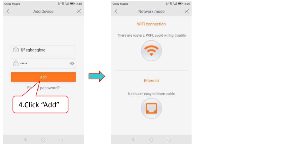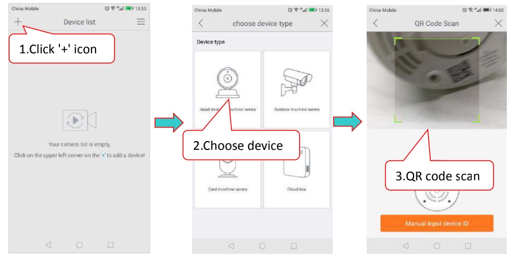 Click on ‘+’ in top left corner, select the device model, scan the QR code and add the device ID, and enter the network connection interface.