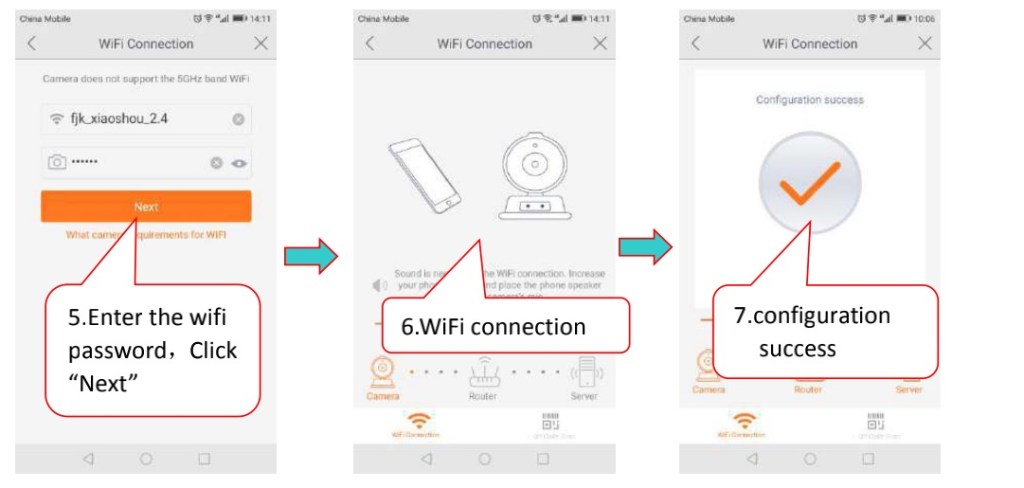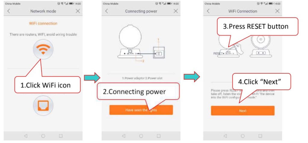 Click the WiFi connection icon and press the RESET button to enter the WiFi configuration mode. Input the WiFi password, the connection should besuccessful!