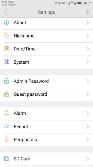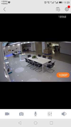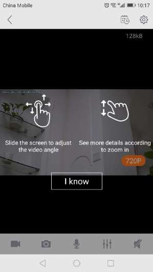 To view a camera’s live video, touch a preview picture. Initial display will show a navigation bar with Buttons of record, snapshot, microphone, speaker, and Image setting buttons.The navigation bar will Disappear after two seconds.Touch anywhere on the live view to activate it again.