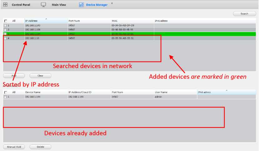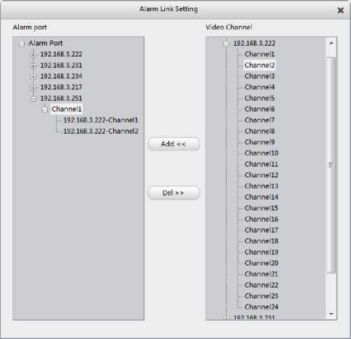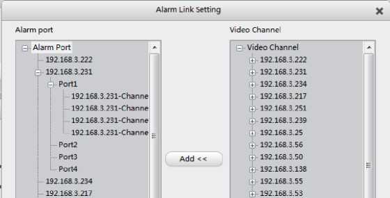 - Set alarm link channels, add channels to port, if the alarm in port is triggered, all the channels added start to record (you can add any device’s channel to port). For example: Figure 10-3means, when alarm in port1 of ‘192.168.3.231’ is triggered, channel1, channel2, channel3 and channel4 will be recorded automatically.