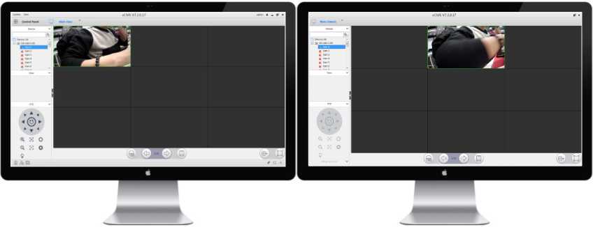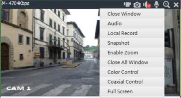 | Main view | Live view, Screen divisions, PTZ controlling, Local record/ snapshot, Update Channel Name, Reboot, UTC Control, Coaxial Control, Listening, Digital Zoom, Color settings, Talk, Sync time. |