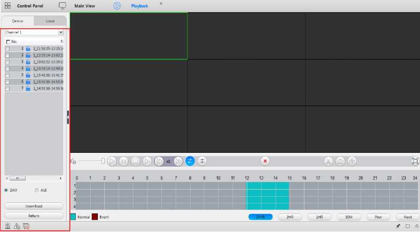 | 1 | Record packet setting | Set the normal record packet time, alarm record packet time when triggered and the record file format (DAV or AVI). |