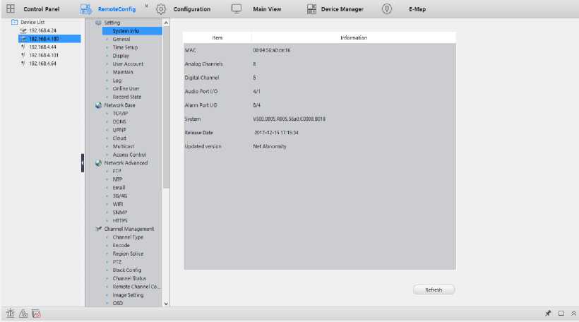 Remote Config: Configuring the network, storage, system and general parameters for the